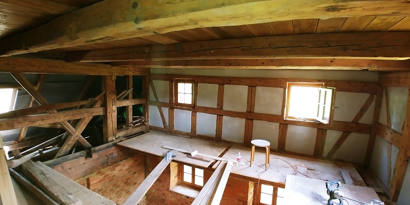 1. Wyrzucić stare wypełnienie, zaimpregnować belki, wypełnić pustki specjalnym tynkiem i farbą firmy Remmers.