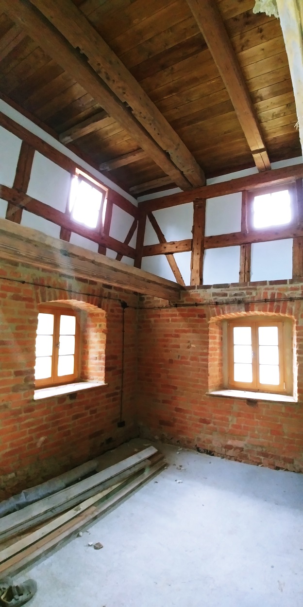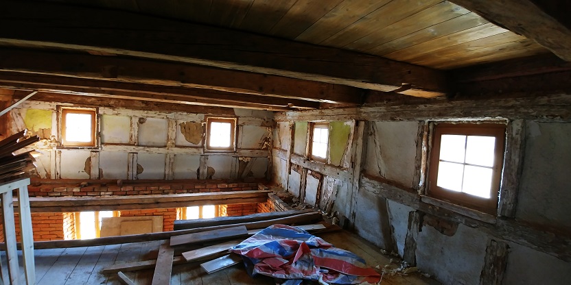 Na piętrze mamy dwie ściany wykonane z konstrukcji szachulcowej. Tworzą ją belki o szerokości 12 cm i przestrzenie między nimi wypełnione gliną i cegłami. Od zewnatrz nie wyglądało to najgorzej. Poprzedni właściciele pomalowali tynk na biało i belki na czarno. Problemem był jednak nadal środek. Wypełnienie było stare, glina popękana, gdzieniegdzie wychodziła słoma i prześwitywały cegły, tynk odpadał. Wszystko zakryte wełną mineralną i kartongipsem - wszystko to usunąłem jak najszybciej i wywiozłem pierwszym kontenerem.