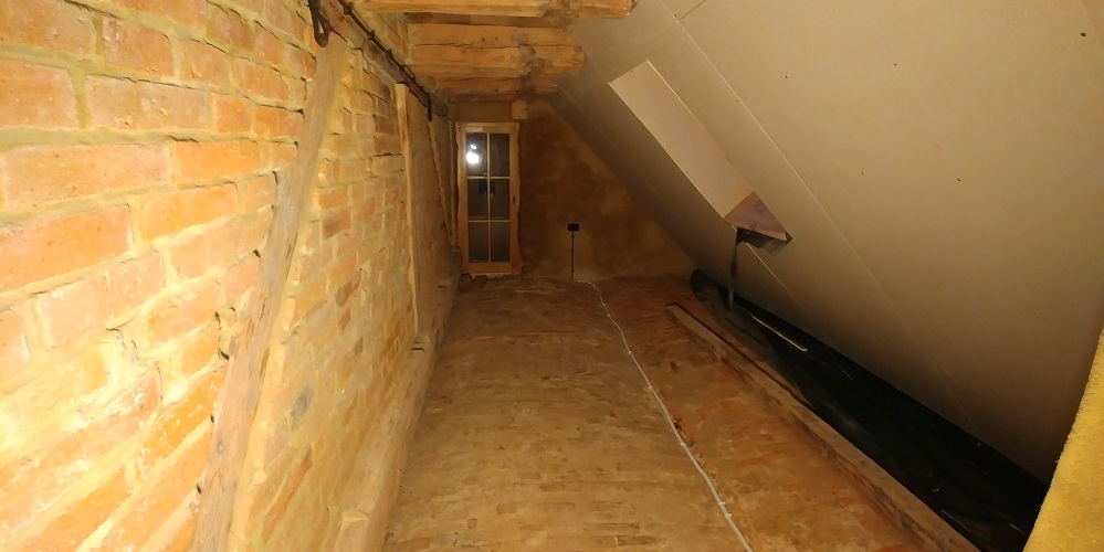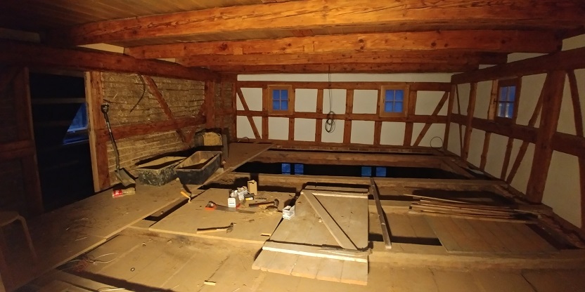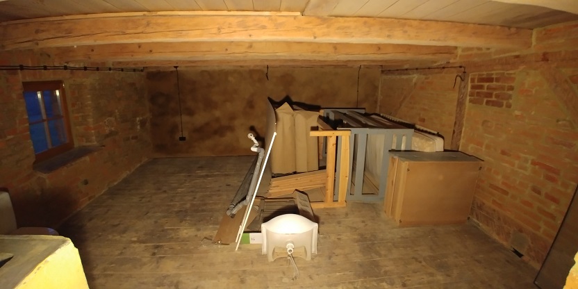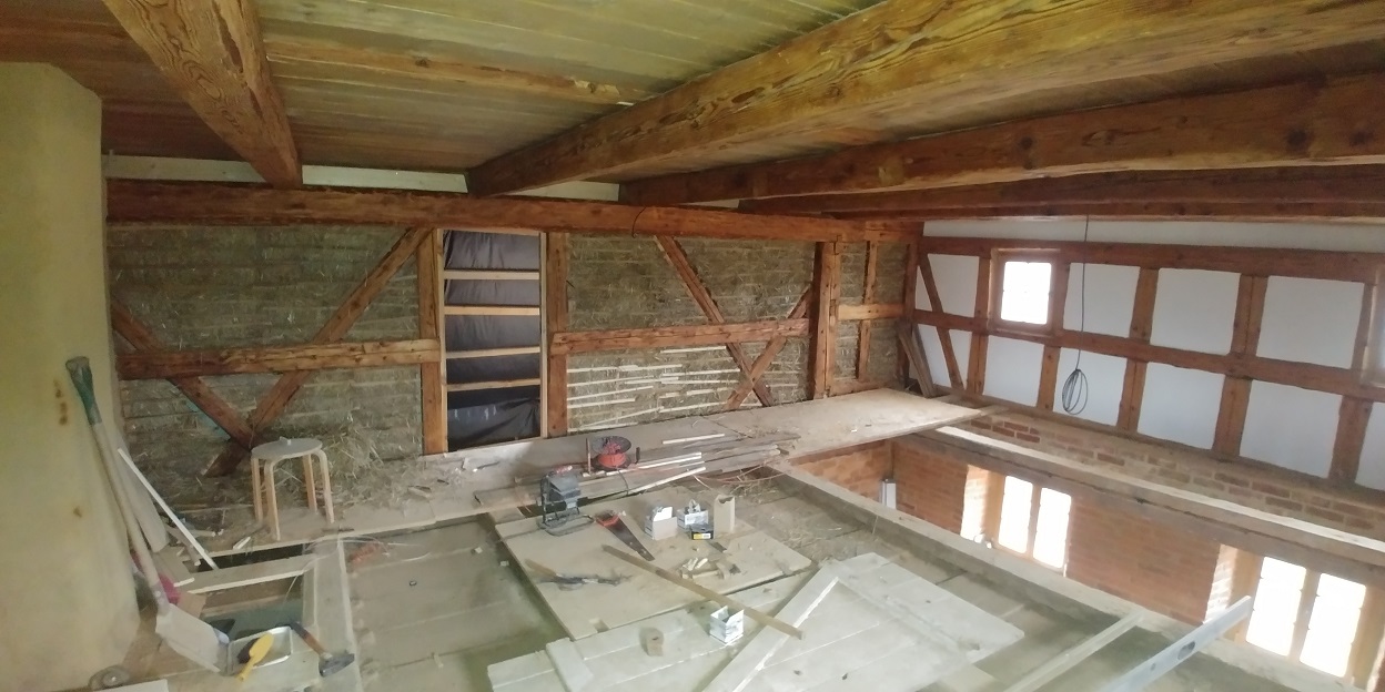 Trwają prace nad wewnętrzną ścianą szachulcową w pomieszczeniu nad kuchnią (antresola). Ściana będzie wykonana tradycyjną metodą z listewek, słomy i gliny. Zostały wyczyszczone i zaolejowane też wszystkie belki w tym pomieszczeniu. W połowie pomieszczenia, będzie pustka nad kuchnią. Toczą się dyskusję, z czego ma być wykonana balustrada i czy ma być na całej długości i czy z kuchni mają prowadzić tu schody.