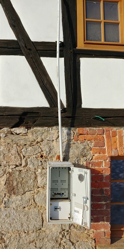 Na zewnątrz udało się usunąć wiszący kabel elektrzyczny, skrzynkę na licznik i peszle z kablami oplatające dom.